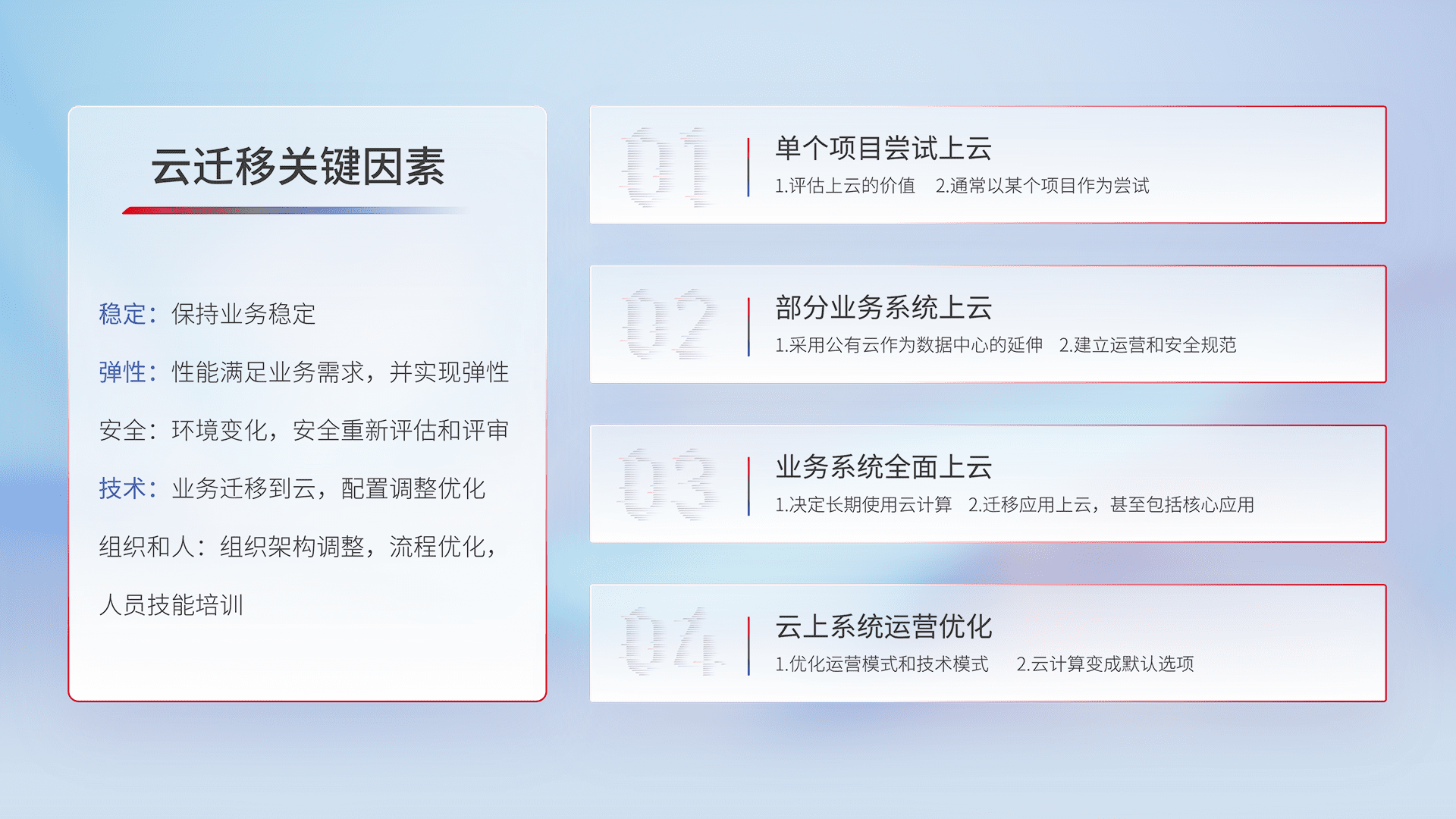 结合实际业务,,从规划设计、、云平台选型、、、云原生改造、、、数据迁移、、集成交付,,,迁移全过程为客户识别最佳上云路径,,,,做好风险识别管理,,设计网络架构、、身份权限、、、安全审计合规、、、操作审计、、、日志审计、、、、监控告警策略、、多站点容灾设计等,,,,对云上基础设施进行整体规划,,,,提升IT治理水平,,,以满足弹性、、、高可用、、高性能的需求。。