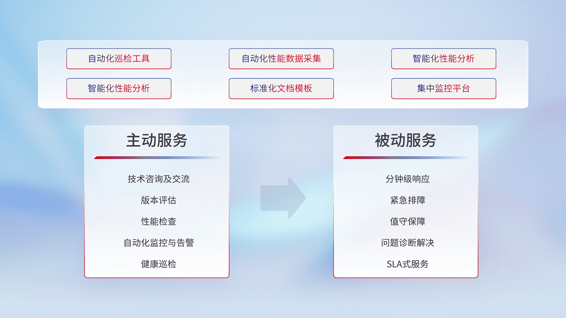 智能化工具和标准化文档,,保障服务质量,,,,提供主动服务(包含技术咨询、、、、版本评估、、、性能检查、、自动化监控与告警、、、健康巡检)和被动服务包含(分钟级响应、、紧急排障、、值守保障、、、问题诊断解决、、、SLA服务)。。。