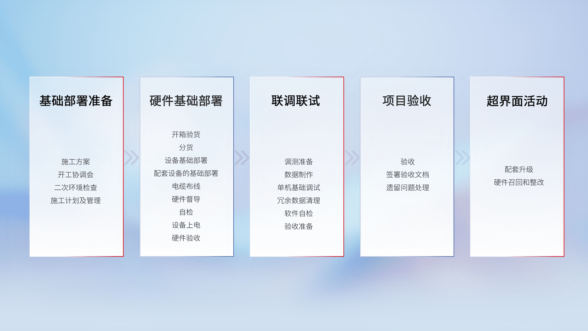 从基础部署准备、、硬件基础部署、、、、联调联试、、、、项目验收、、、越界面活动的全过程可追溯,,保证施工质量和进度。。。。