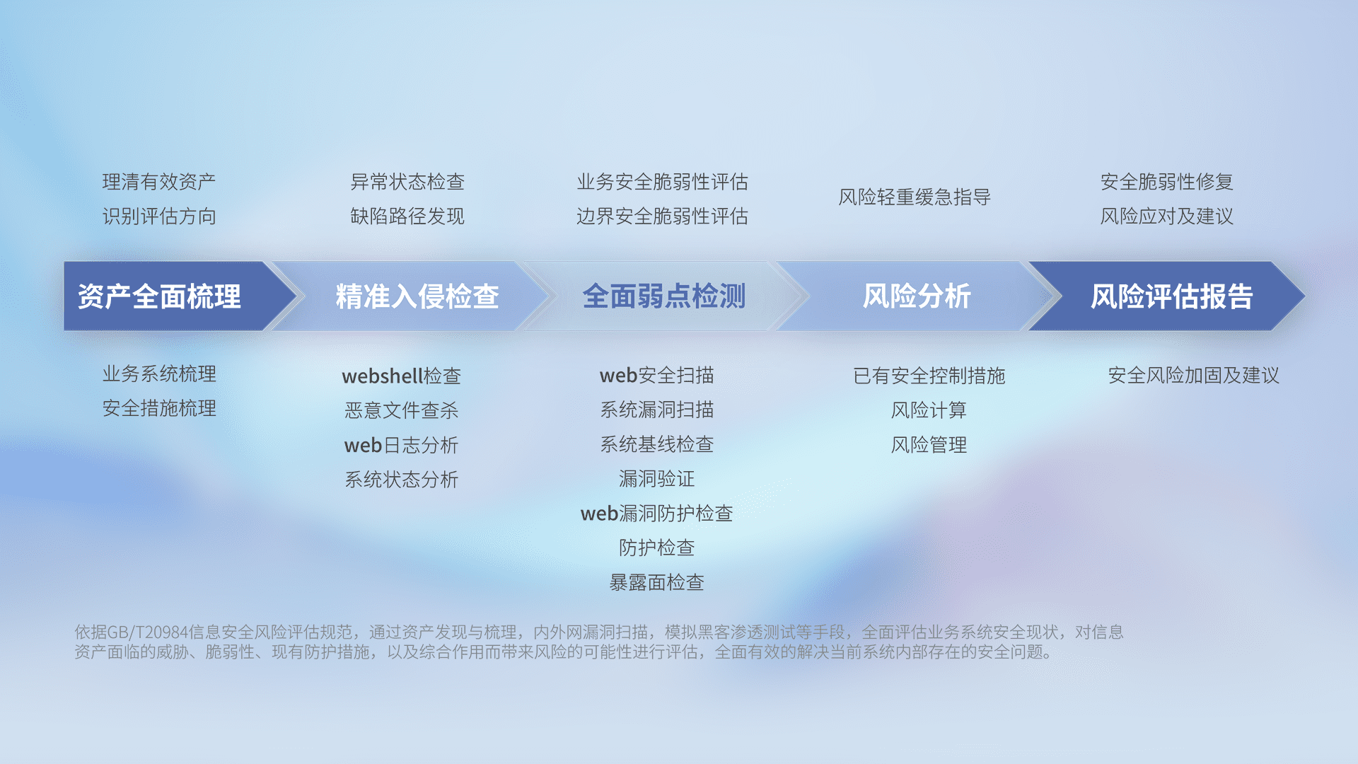 针对客户行业特性,,,,以专业的安全服务+多厂商联合解决方案提供专属的一站式安全管理服务,,帮助客户全面感知网络空间威胁,,,基于识别、、检测、、分析、、、防护、、、、监测、、、、响应的服务理论模型,,,从方案咨询、、、、集成交付、、、、评估验证、、、优化加固、、运维运营,,,致力于为客户提供完整的闭环管理式安全服务。。。以实战经验为客户打造高抵御风险的安全体系,,帮助客户发现威胁、、对抗威胁、、处置威胁,,,不断积累安全对抗能力,,持续保障数字化安全。。。